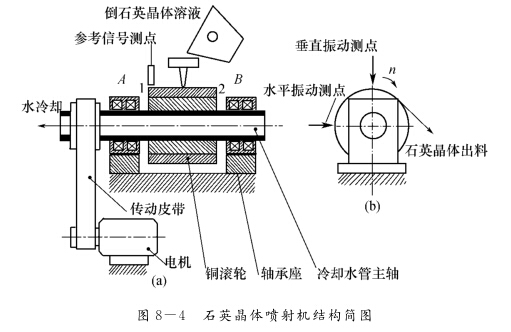 ???? 如下圖所示,用電爐融化的石英晶體溶液通過漏斗倒在高速旋轉的銅滾輪上。滾輪冷卻水管主軸通入循環(huán)水冷卻。石英晶體溶液在高速旋轉的圓周力和離心力的作用下甩出,形成石英晶體薄片帶。其厚度只有0.2mm,并不允許有波紋。滾輪的徑向跳動小于0.01mm。對軸承振動的要求為5μm。