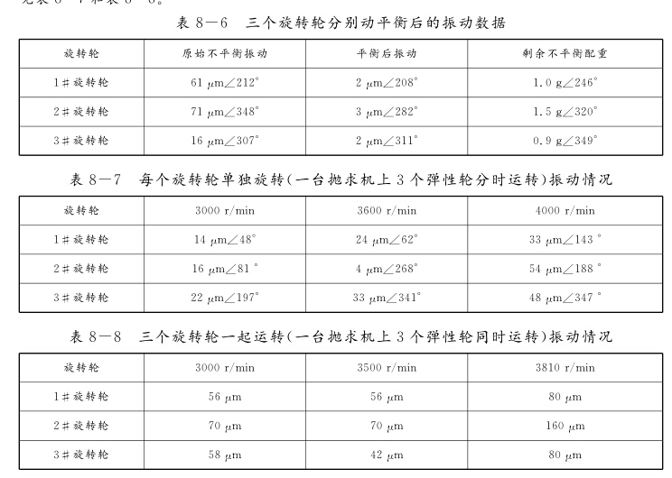 ???? 旋轉輪在1780r/min平衡后,準時升到2100r/min時,振動7μm∠7o,發(fā)生了5μm的變化。然后將3個旋轉輪裝在拋球機上,分別對每個旋轉輪進行現(xiàn)場動平衡。